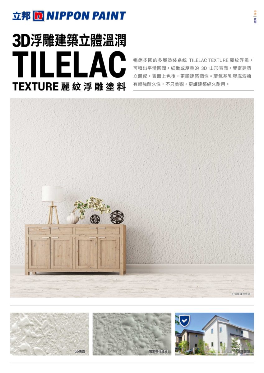 立邦麗紋浮雕Tilelac Texture Base Coat 為暢銷多國熱銷商品,採特殊苯乙烯-丙烯酸乳液精製開發,為多層塗裝系統中的中塗層。可噴塗出平滑圓潤、細緻或厚重的3D山形造型,豐富建築立體感。厚塗質感紋理,還能有效彌蓋牆體細微裂紋及牆身多孔凹紋。搭配塗刷立邦外牆商品,表面上色後,更顯建築個性。